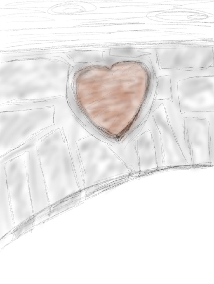 When I first looked at the stone heart, I just got a general idea of what it was: a stone heart on a brick wall. But after drawing it, I noticed the weathered stone, the cracking pavement around it, the orange bricks holding it in place, and the rotting wood in the roof; I finally registered and felt the weight of its presence. The thought of it being there for so long that the area around it was starting to be damaged made it more impactful because I could finally see the impact it had on millions of others.