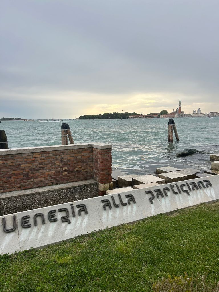 Ironically enough, we were going to the Biennale in the days following the Vivaldi concert, so it was a fruitful effort! With something to go off of, we went looking around the Biennale to see if anything fit the description. We asked workers at the Biennale, and one pointed to the shore and said, “Alla partigiana“. At first, my partner and I were a bit lost, but he then called over another worker. He explained there’s a statue of a sleeping woman in the water named Venezia alla partigiana. This roughly translates to “Partisan woman”; it was created to honor the women of the Italian resistance.